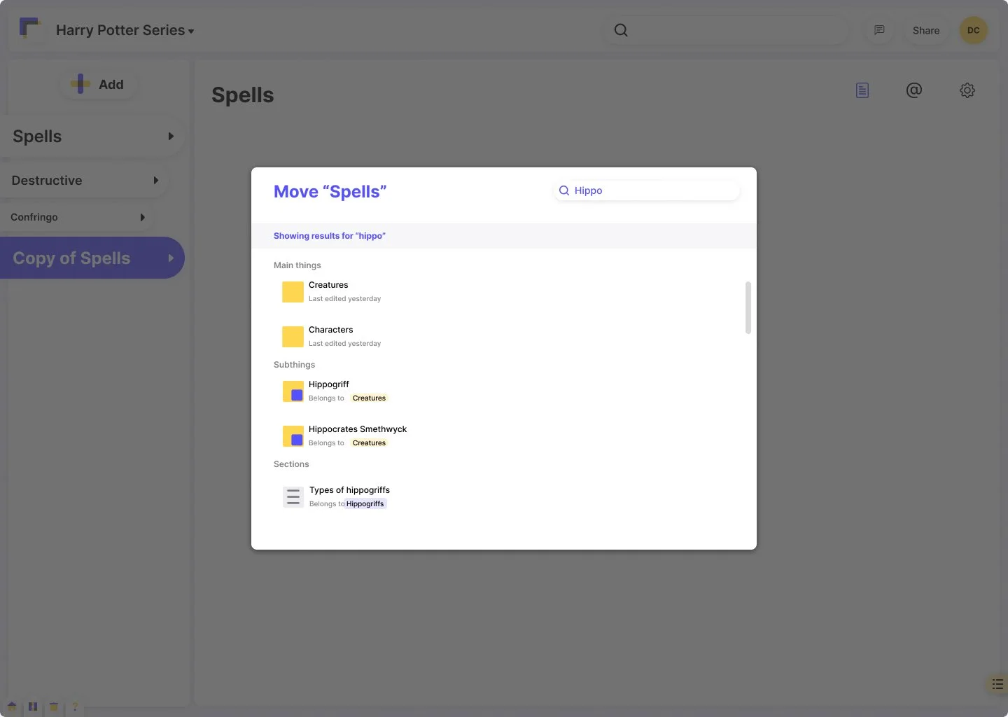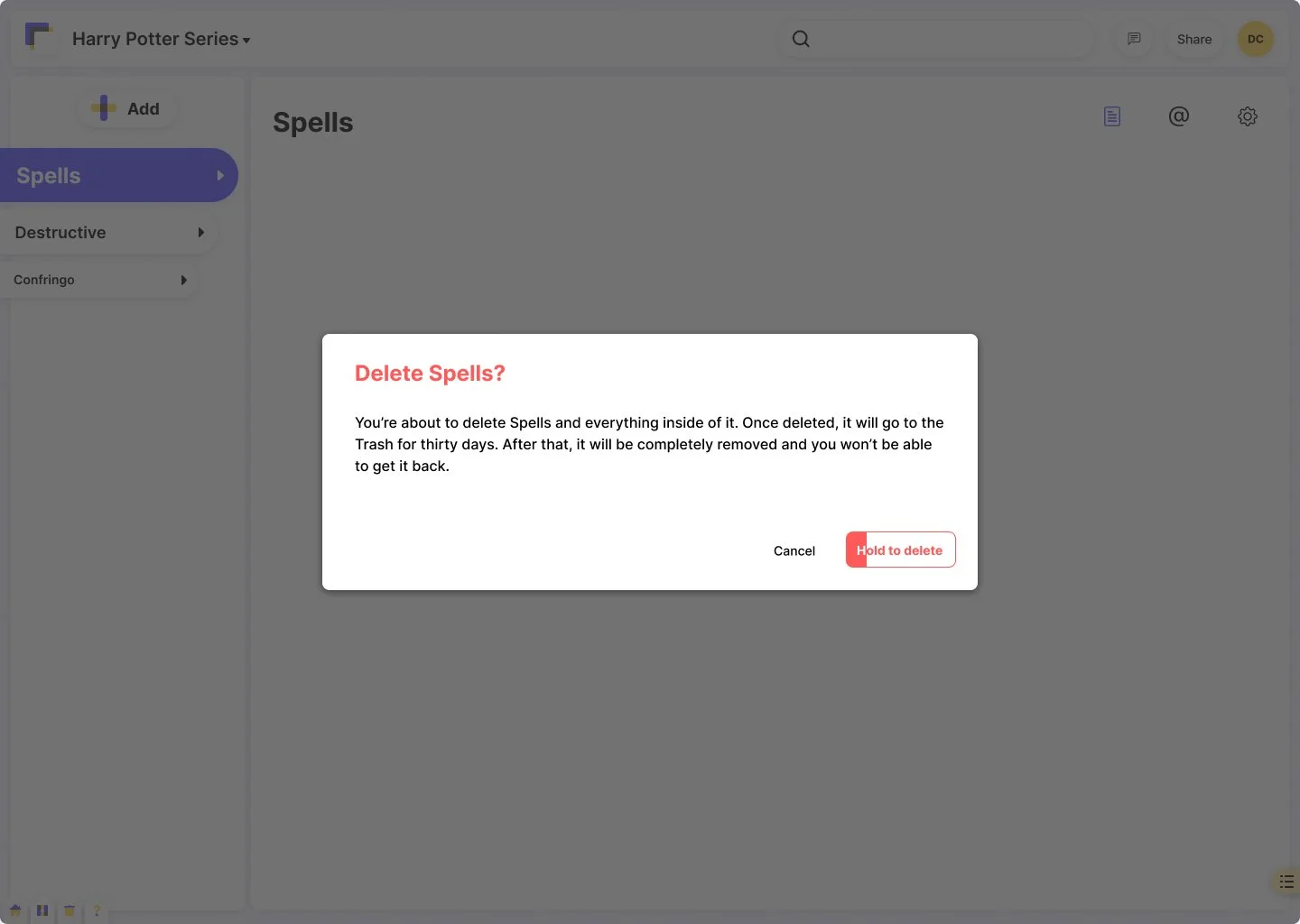 I designed a full interaction model covering every state: selected, hidden, locked, hidden and locked, right-clicked, copied, moved. I built a Move modal with search and hierarchical navigation. I designed a "hold to delete" confirmation pattern specifically to slow down destructive actions, a deliberate friction that protected writers from accidental data loss.