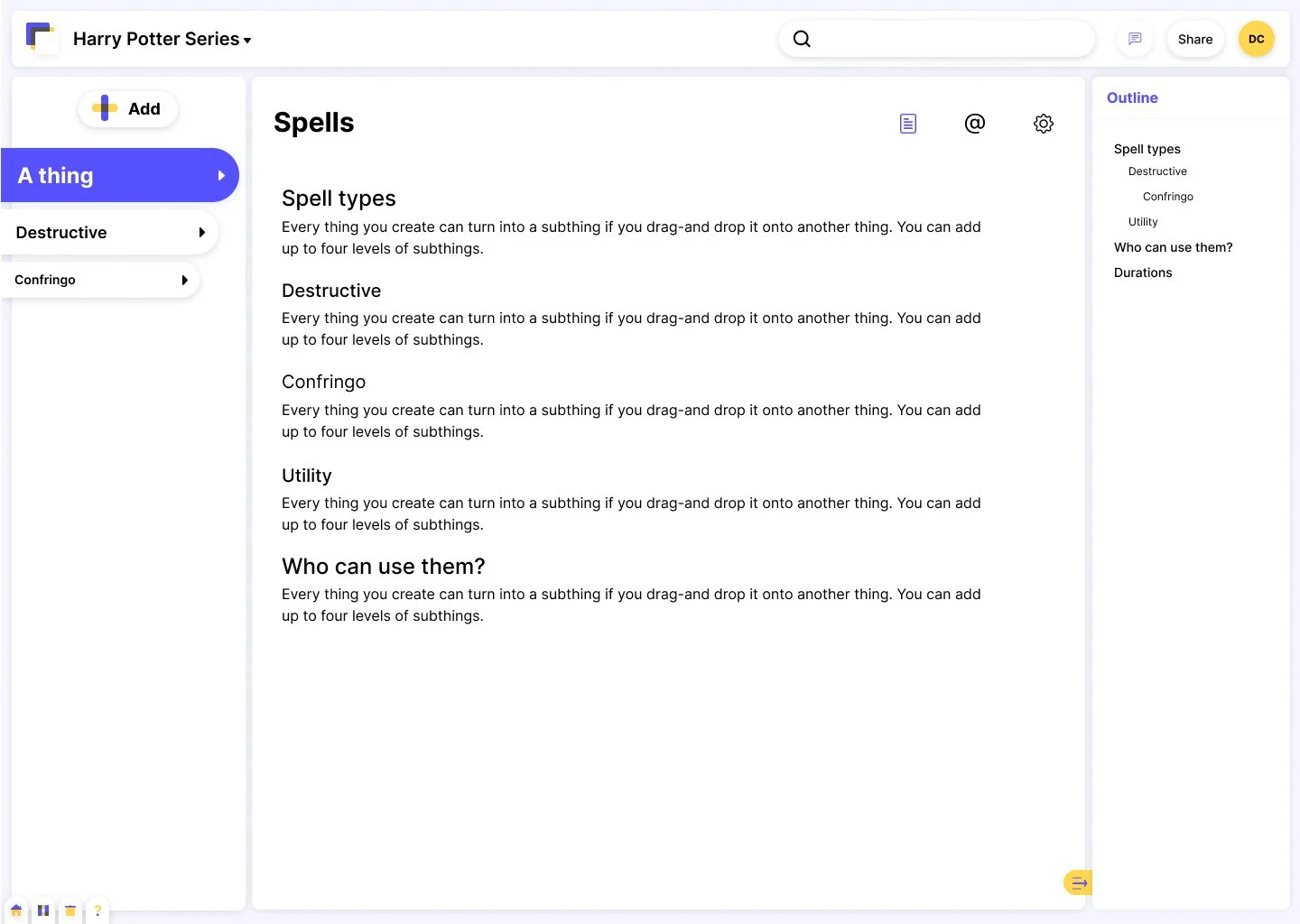 The central design challenge was how to represent the database layer without it competing with the writing experience. Many world-building tools force you into their own categories. I wanted Backstory's database to be dynamic so any writer could shape it how they wanted. Originally, I developed a concept I called "Things", where the writer documents their world. Characters, places, spells, creatures, plots. Each Thing had sub-Things, and each sub-Thing could have more sub-Things.